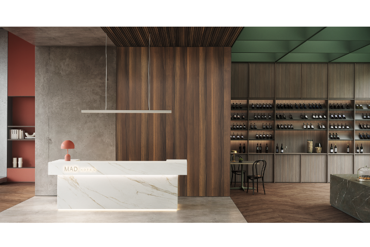 Transformad ha presentado su último proyecto de estilo vanguardista, el MAD Hotel. Se trata de una nueva propuesta con materiales nobles como la madera y la piedra natural, con la colección Tmatt, la superficie supermate, antihuella y autorregenerativa, como protagonista.