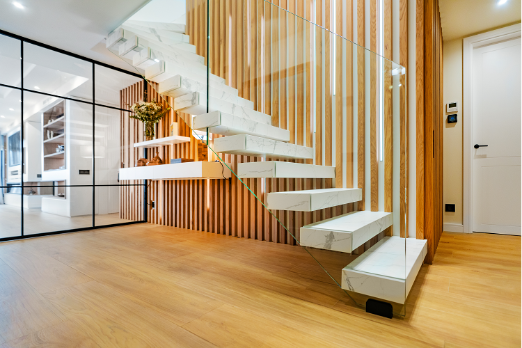 En el distribuidor que conduce a la escalera, la pureza de líneas se consigue a través de un revestimiento realizado con listones de madera verticales, magnífico recurso utilizado en varias estancias que aporta gran sensación dinámica, de movimiento y evolución. Ritmo que se potencia mediante iluminación vertical y grandes peldaños en blanco de superficie ultra-compacta con una camuflada barandilla de cristal.