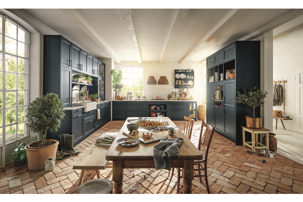 Una cocina como un paseo por campos mediterráneos, donde se unen naturalidad e inmensidad, y el placer culinario tiene un hogar. Un toque campestre especial gracias a frentes de color azul profundo satinado con poros que, con discretas vetas de madera y refinados tiradores de latón, transmiten una sensación de comodidad intemporal. La encimera de cuarzo de Systemo y los armarios con puertas de vidrio crean un contraste visual y se integran con armonía en la atmósfera naturalmente sencilla que puede hallarse también en detalles, como los cajones y las cajas flexibles de roble natura, los espacios abiertos con estantes, el típico estante con platos, o el soporte arqueado del estante principal.