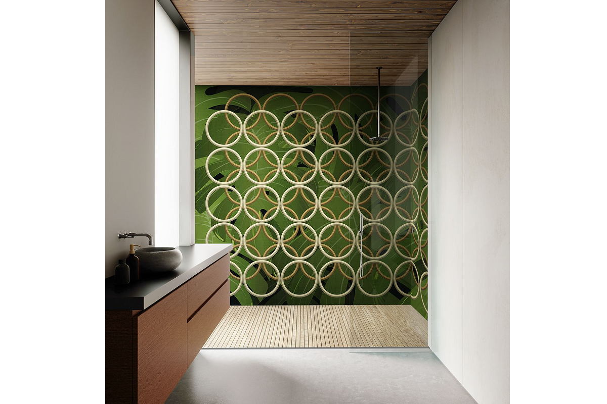 En las imágenes, círculos y cadenas se cruzan entre sí, se superponen y emergen del fondo como formas nítidas y definidas que crean perspectivas capaces de transformar los espacios, dando a las paredes un extraordinario efecto de movimiento.