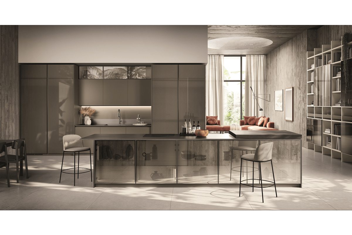 Las nuevas variantes de color amplían así la gama de lacados, brillo y mate, y se ofrecen también en una característica versión con duelas verticales que además se presenta en cuatro colores enchapados. La peculiaridad del modelo también se destaca por la puerta con bastidor de cristal, disponible en versión lisa o con duelas verticales y horizontales, en color liso o en los tres colores nacarados: de este modo es posible crear combinaciones diferentes, estimulando evocadoras sensaciones táctiles y visuales. Para un efecto tono sobre tono, las golas y los zócalos se combinan con las puertas.