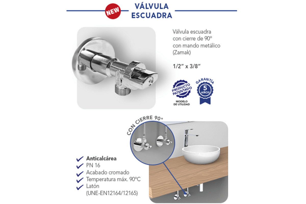 Según informa la compañía, la válvula escuadra América con mando metálico es una de las piezas más utilizadas en las instalaciones de agua fría y caliente para agua sanitaria. Se encarga de cortar el paso del agua a lavabos, fregaderos, cisterna de inodoros y de otros puntos de consumo y así poder realizar su reparación o sustitución.