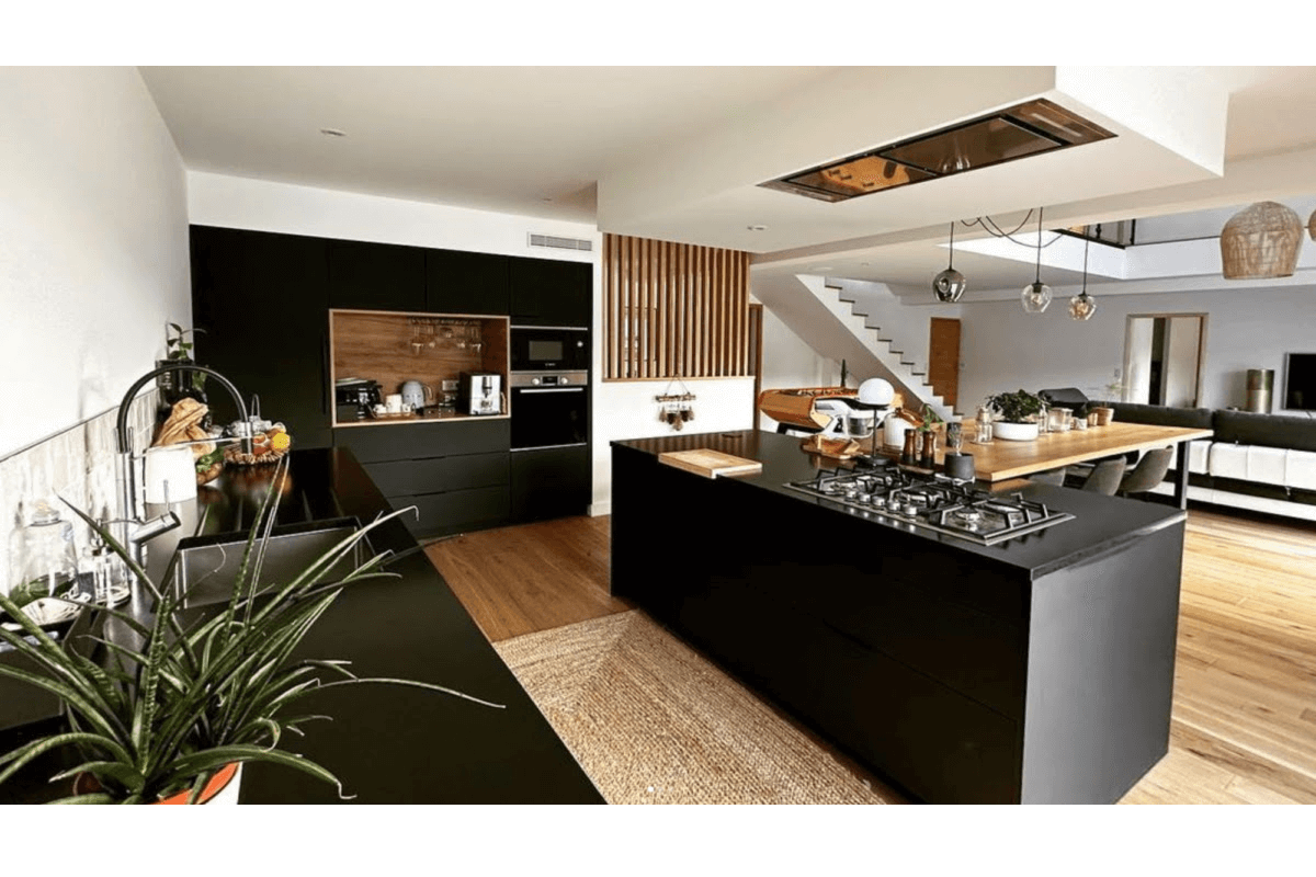 Las cocinas negras son elegantes, sofisticadas y gracias a sus acabados mates se integran muy bien en espacios abiertos de cocinas abiertas al salón comedor. Sin miedo alguno a integrar la cocina en el resto de la estancia, este magnífico proyecto de CUISINE DECÓ con modelo M190 Fenix de MÉTODO en negro, combina elementos abiertos decorativos en madera que son un perfecto ejemplo de cómo el interiorismo actual gira en torno a la cocina.