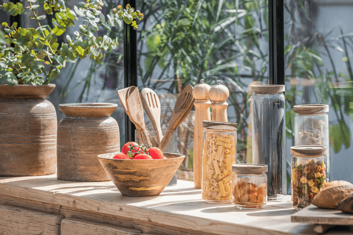 Los recipientes de bambú de varios tamaños y diseños son perfectos para almacenar alimentos secos como arroz, pasta, cereales y especias.