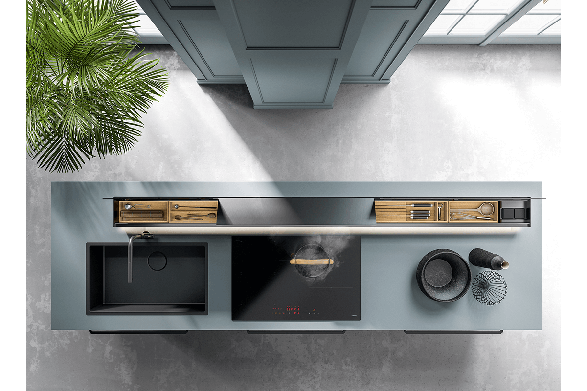 Monolith transforma el concepto de extracción en la cocina en una solución multifuncional, configurada como un conducto equipado, compuesto por un módulo de campana de 90 cm que puede combinarse con módulos de almacenamiento adicionales de 30, 60 y 90 cm. En estos últimos caben accesorios de madera de haya natural, como utensilios de cocina, tablas de cortar y especieros, tomas eléctricas y USB.
