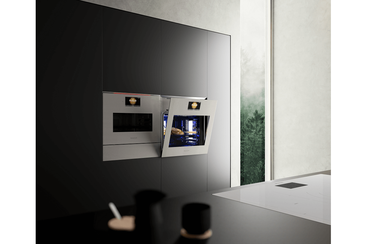 Los hornos combinados, que pueden integrarse con el cajón calentador, y la placa de inducción Flex se caracterizan por una estética refinada y esencial: entre sus características destacan el acabado exterior en cristal negro o plateado, los mandos integrados mediante pantalla táctil de alta definición y la instalación a nivel en el mueble de cocina.