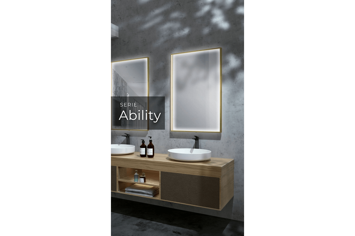 El modelo ABILITY, es un espejo con luz perimetral integrada en el marco de aluminio, disponible en dos acabados: negro mate y oro cepillado.