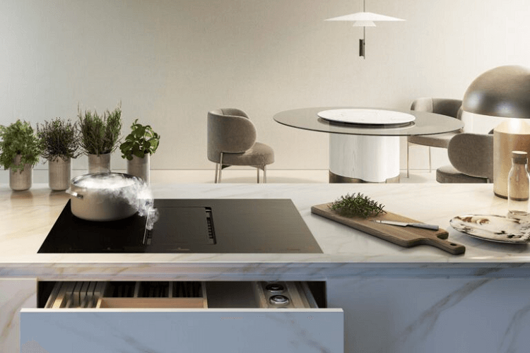 La placa de cocción con aspiración integrada FONDA está disponible para instalación sobre encimera con un marco o enrasada. Además, permite aprovechar el espacio pudiendo instalar un cajón cubertero, gracias a su profundidad de tan solo 8 cm.