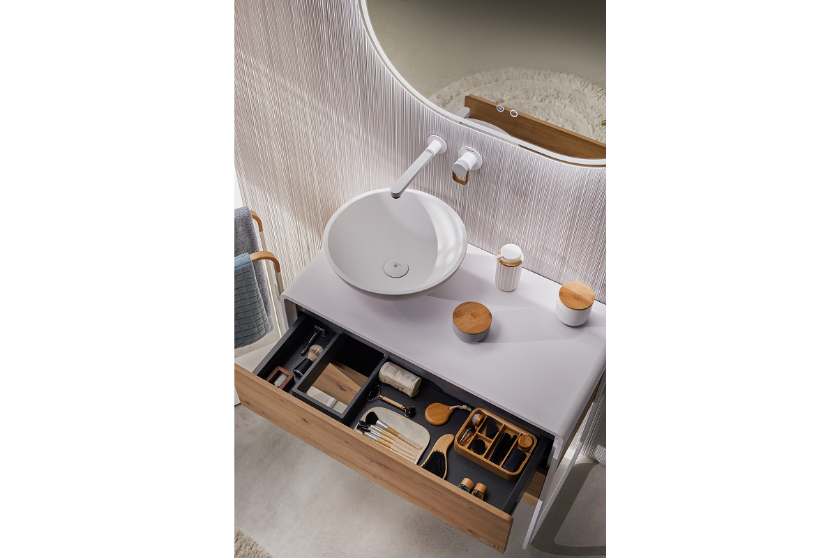 Los muebles combinan diseño, a través de las texturas, materiales con acabado en madera y diseño curvo; así como, la practicidad gracias a los dos grandes cajones en madera con organizadores en el mismo acabado. Para garantizar una mayor comodidad, los cajones del lavabo incorporan el sistema "push" para su apertura y amortiguadores hidráulicos en las guías de los cajones para garantizar un cierre suave y silencioso.