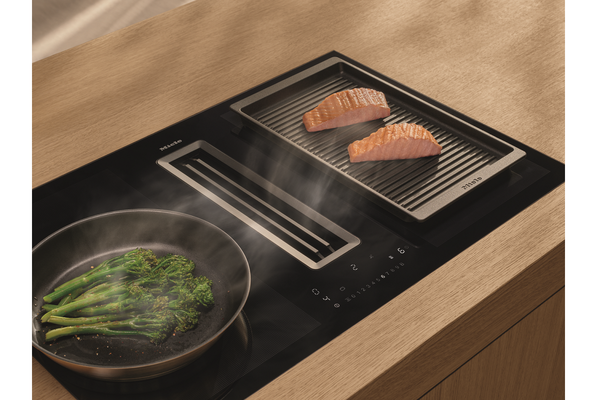 La placa de inducción con extracción integrada de Miele es ideal para cocinas abiertas al salón, combinando diseño y funcionalidad en un solo electrodoméstico. Al integrar la campana extractora, ahorras espacio sin renunciar a la capacidad de eliminar olores y humo de forma eficaz.