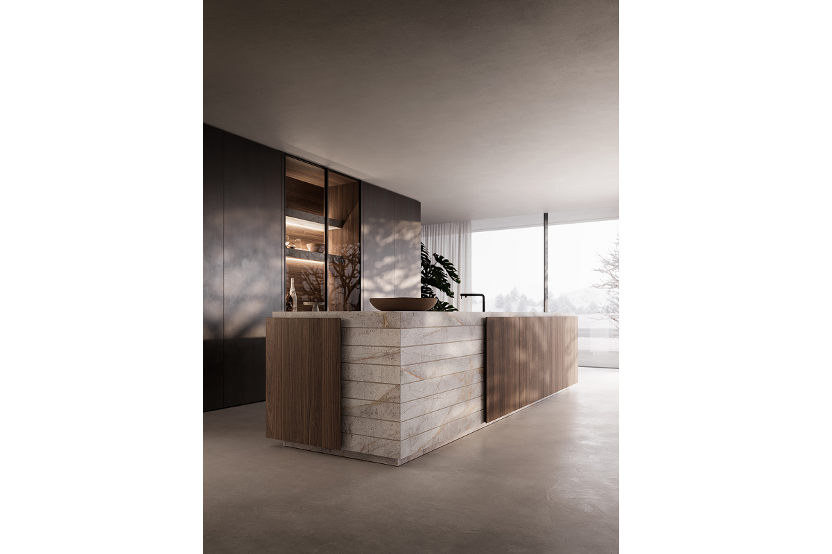 La perfecta reproducción en gres del Mármol Appennino, desarrollada en exclusiva por Modulnova, se une a la madera al aceite del acabado Nogal Classic, elaborada con ingenio y cuidado artesanal. La puerta Fold, de madera de Nogal con la técnica de folding con inclinación del perfil a 30° y un espesor de 3 cm, envuelve en parte la isla de Gres Appennino, también en la zona de la esquina, dejando un borde de 4 cm respecto al tablero y creando un elegante efecto estético que destaca la continuidad del material y la profundidad de la isla.