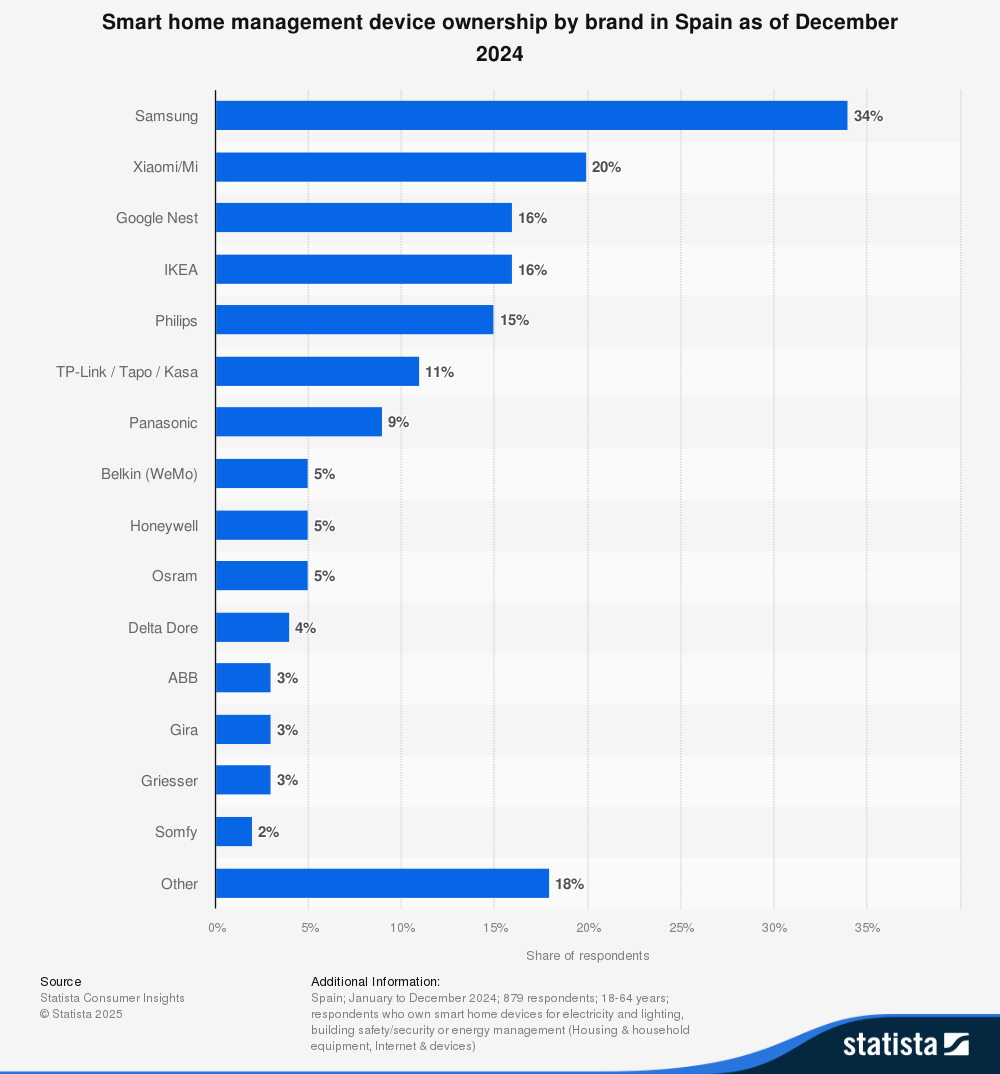 El porcentaje de Samsung es claramente superior a sus perseguidores inmediatos. Xiaomi es la segunda marca más elegida por los españoles para automatizar sus hogares con un 20% de cuota de mercado. El pódium lo cierra Google Nest e Ikea con una cuota del 16%.