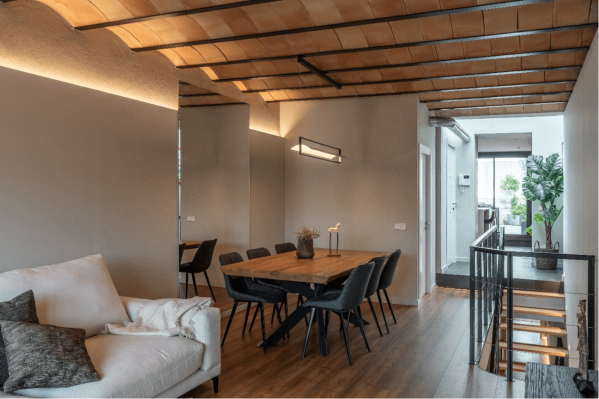 Por otra parte, el salón-comedor es un refugio cálido. Cabe destacar el acabado ligeramente rústico del pavimento de parquet, que aporta textura y autenticidad. El carácter y un punto de artesanía lo pone el techo de bóveda catalana manual destonificada, estableciendo un diálogo armónico con los elementos más contemporáneos.