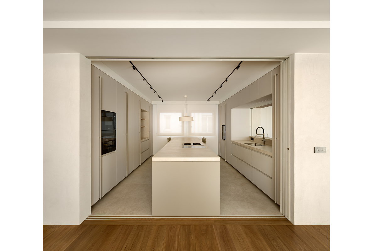 La cocina se estructura en torno a una gran isla central, auténtica protagonista del espacio. En ella se integra una placa de cocción con sistema de extracción de superficie BORA Professional, eliminando barreras visuales. La encimera de Lithotech Vonn, de gran resistencia y elegancia, se prolonga para formar una mesa alta, ideal para compartir momentos de manera informal.