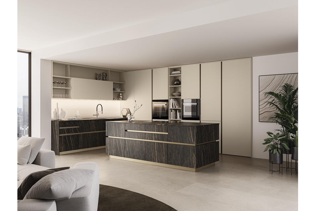 Colección ICONICA con Isla de cerámica Calacatta Crema Rain y columnas lacadas mate Camoscio.