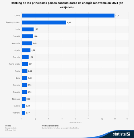 Por países, y según datos del Instituto de la Energía, China se convirtió el año pasado en el principal consumidor de energía renovable, con 13,9 exajulios consumidos. Los datos (que no incluyen la energía hidroeléctrica) relegan a Estados Unidos al segundo lugar, con 6,65 exajulios de energía renovable consumidos. Les siguen India (1,77), Canadá (1,66), Alemania (1,49), Japón (1,29), Turquía (1,02) y Reino Unido (0,91). Según el Instituto de la Energía, España es el duodécimo país del mundo que más energía renovable consume.