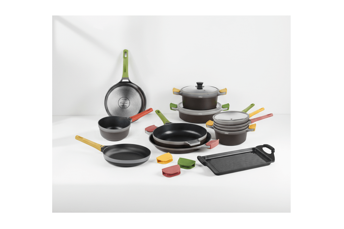 La propuesta estética es también clave en esta nueva familia de menaje. Combina líneas arquitectónicas en grises y negro con asas, mangos y siliconas de colores que se pueden seleccionar al gusto. Revolutline está disponible en cuatro tonos diferentes coordinados y además incluye siliconas intercambiables que permiten personalizar el menaje y dar un toque único a la cocina.