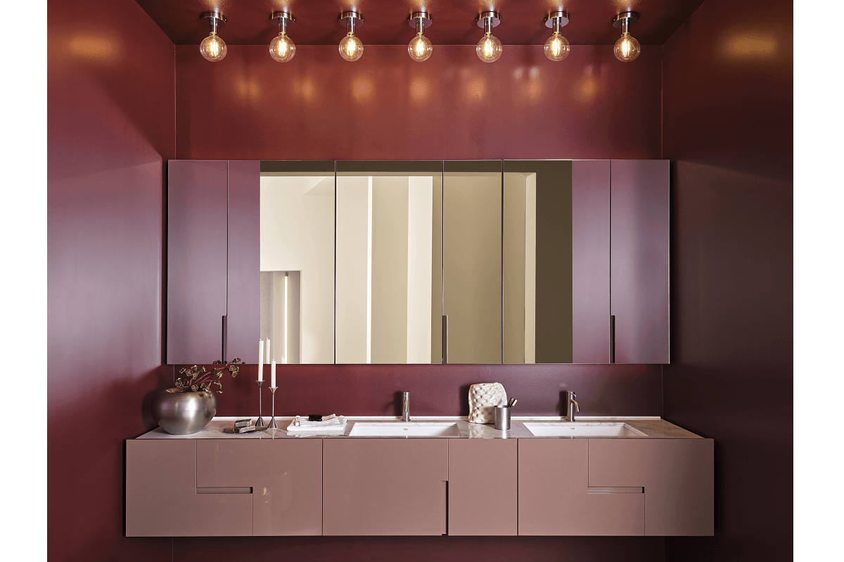 El eje central de la propuesta gira en torno a la amplia y cómoda cubeta del lavabo, desde la que se extiende la encimera, disponible en cerámica o en las preciosas versiones en mármol Bianco di Carrara o Nero Marquina. La variante más lineal de Filo parte de un lavabo con banda de madera, en esencia o lacada, y repisa de apoyo, para luego articularse en un modelo más estructurado con un amplio cajón contenedor. En este caso, las puertas del mueble presentan tiradores integrados, horizontales o verticales, que con emocionante sencillez crean interesantes juegos geométricos.