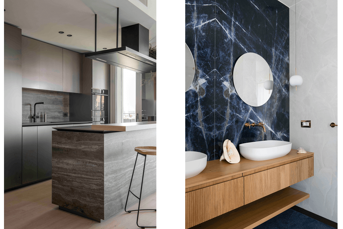 Entre las residencias, destaca el ático como el más representativo, con una terraza panorámica y una piscina privada. En este caso, Mo.1950 colaboró activamente con el cliente y Filcasa para interpretar sus necesidades y fusionarlas a la perfección.
