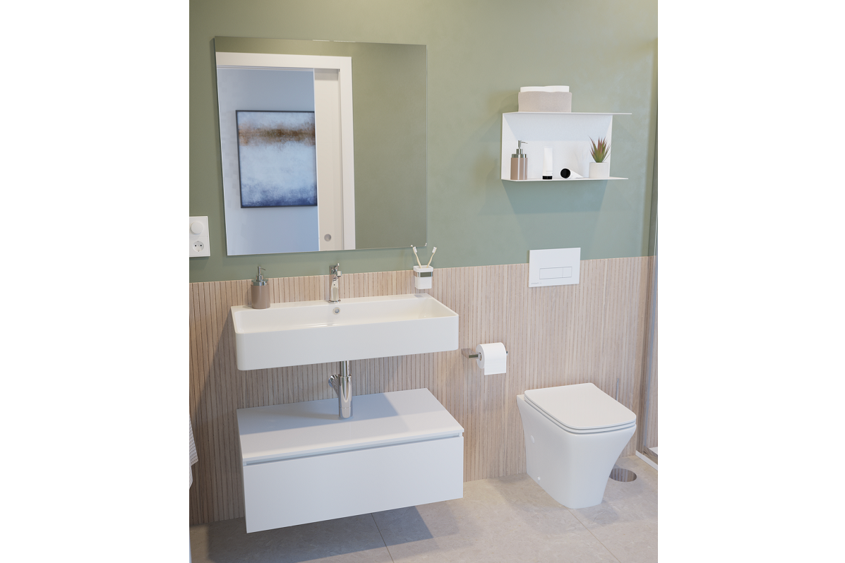 Fabricado en España con tablero de partículas (PB) de alta calidad, el mueble se entrega completamente armado, lo que facilita una instalación rápida y sencilla. Su diseño suspendido no solo aporta un toque elegante y moderno, sino que también optimiza el espacio y facilita el momento de la limpieza del baño.