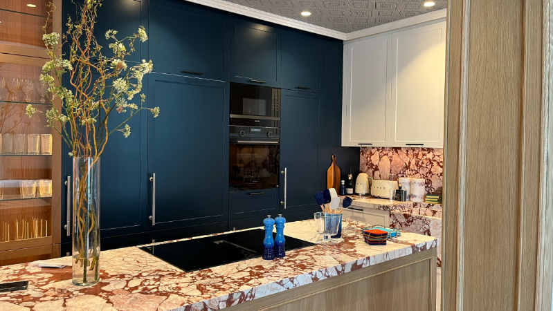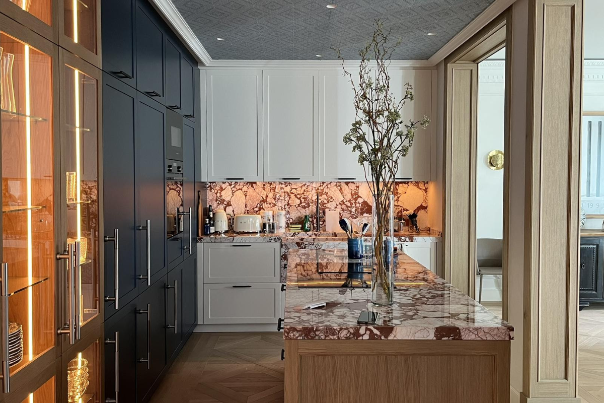 La isla central no es solo un punto de cocinado, sino también el corazón social de la cocina. Con detalles en madera natural y una encimera en el mismo mármol que el salpicadero, se convierte en un punto focal cargado de personalidad. Esta solución permite cocinar, servir y compartir de forma fluida, reforzando el carácter multifuncional que exigen los nuevos espacios del hogar.