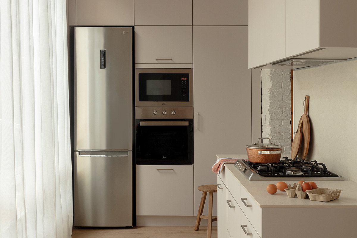 La nueva cocina es de planta rectangular y se ha distribuido en dos zonas: la de cocción, que se coloca frente al gran ventanal que da al patio con jardín, y la de fregar, que se ubica frente a la puerta de acceso al mismo. Y en uno de los extremos se concentran las columnas altas de cocina, promoviendo un orden visual calmado para el ambiente.