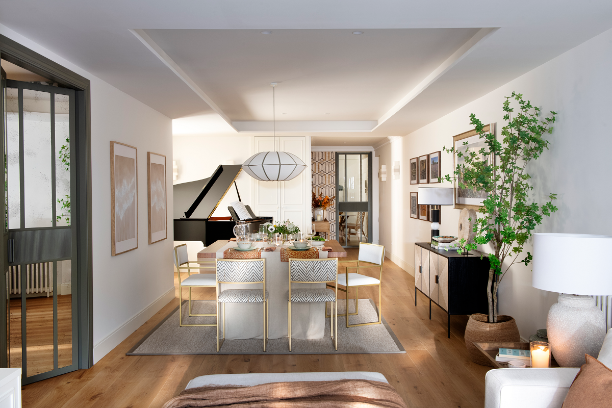La zona de comedor la preside una mesa española cuadrada, de 140x140 cm, ideal para recibir invitados. Sobre ella, destaca una gran lámpara suspendida, diseñada a medida para el proyecto, en tela blanca y con detalles en verde. Las sillas ponen el toque sofisticado y rompedor, en estructura dorada mate y tapizado en tela gris antracita y blanco.