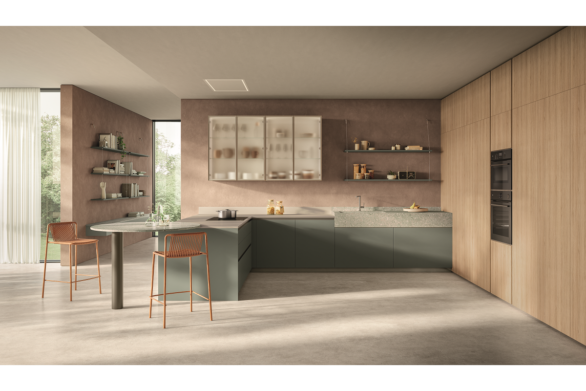 Essenza no se limita a la cocina, sino que se extiende naturalmente también a la sala de estar, integrando los nuevos accesorios Cross Elements que amplían la libertad compositiva y potencian la continuidad entre los espacios, como las soluciones Solaris Back y Air Box, las boiserie Vertical System, los muebles de altura completa Maxidoor, el sistema modular Freepass, que crea transiciones inteligentes entre los ambientes; y los módulos Sail con puertas salientes, que aportan ritmo y dinamismo a las composiciones. Cada detalle contribuye a crear ambientes sin límites, en los que la estética y la funcionalidad interactúan con armonía.