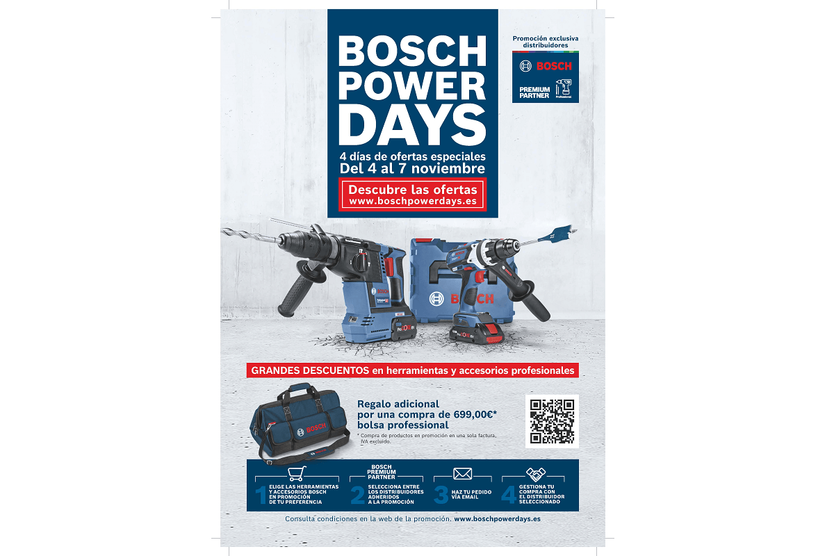Con el objetivo de apoyar a los profesionales, Bosch celebrará del 4 al 7 de noviembre la primera edición de los Bosch Power Days, una iniciativa que ofrecerá grandes descuentos exclusivos en herramientas profesionales, de medición, accesorios y soluciones de jardín profesional. También se incluyen novedades y combo kits a batería de 18V con la obtención de dos herramientas o más con baterías y cargador, preparados para dar respuesta a trabajos profesionales específicos.