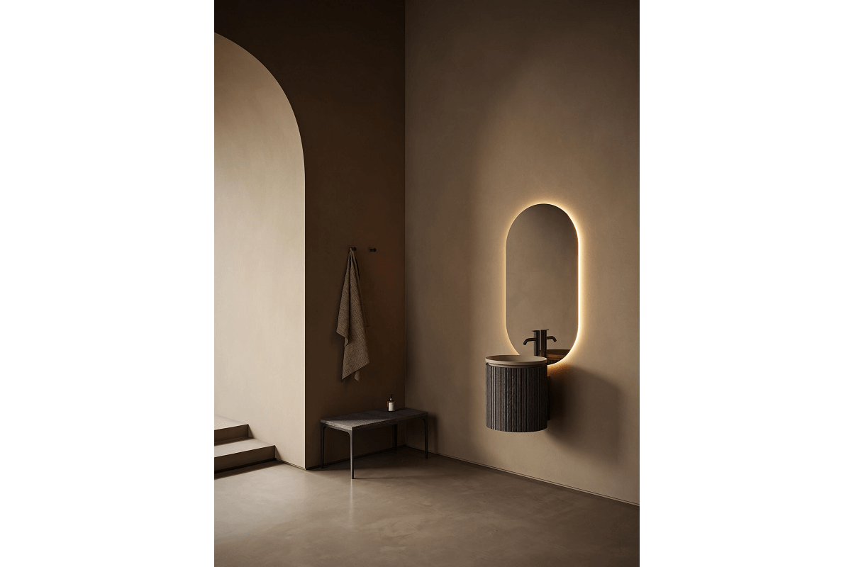 Lavabo suspendido GrateRound40 de Inbani en acabado UHS avellana 288 y madera de roble gris S3 555.