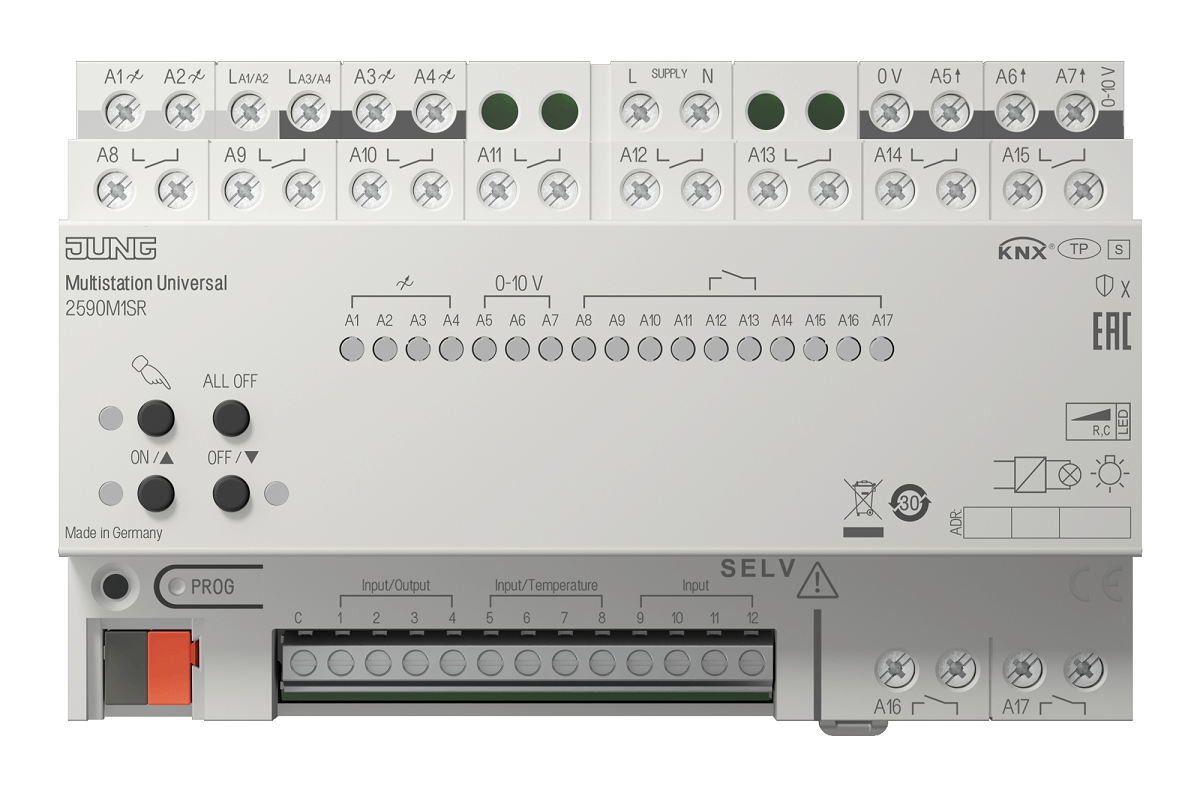 Los nuevos Multistation y Multistation Universal (de 4 y 8 módulos, respectivamente) para carril DIN son dispositivos KNX compactos que simplifican el proceso de cableado y la posterior programación del sistema. Entre los sensores que pueden integrarse se encuentran la sonda de temperatura remota, los detectores de movimiento y los contactos magnéticos, además de sensores de inundación o de condensación. Esta capacidad de entradas facilita el control integral de la estancia, abarcando funciones de iluminación, seguridad (contactos de ventana o puerta) y climatización.