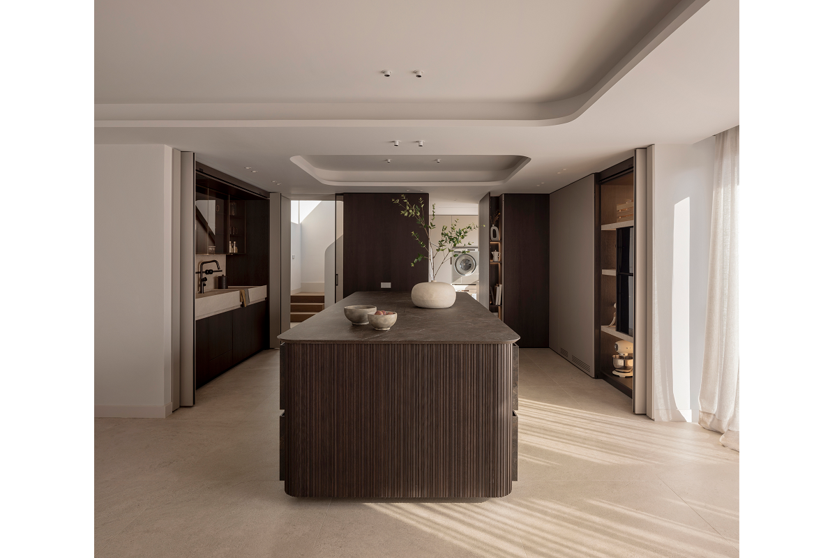 Las curvas articulan el espacio con naturalidad, uniendo la cocina y las áreas adyacentes mediante un trazado continuo y equilibrado. Su forma suaviza la geometría, aporta líneas limpias y ordenadas, y suma un carácter orgánico que equilibra la precisión del diseño.