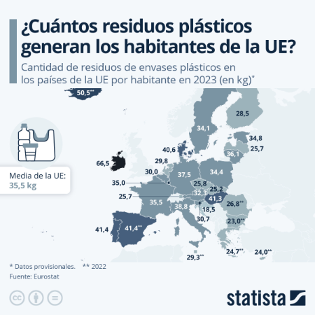 En este caso, España se sitúa a la cabeza de los países europeos con mayor generación de residuos de plástico. Con 41,4 kg por persona y año, el volumen de residuos plásticos en España es un 20 % superior a la media europea y solo es superado por Irlanda (66,5 kg).