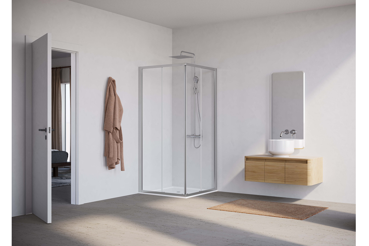 prima 2000 está disponible con perfiles en acabado plata mate y plata pulido brillante, y con opciones de cristal que van desde el transparente hasta el Cincillà, caracterizado por sus patrones de superficie en relieve, para adaptarse a todos los estilos de decoración.