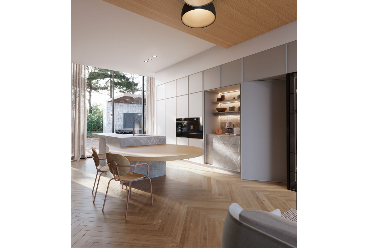 ROA, una cocina limpia, de líneas precisas y atmósfera relajante, donde nada distrae y todo fluye. Todo queda integrado, contenido, oculto tras superficies continuas que ordenan y calman la mirada. Tras esa aparente sencillez se despliega un universo funcional: un desayunador perfectamente iluminado, una despensa discreta y una lavandería oculta que ...