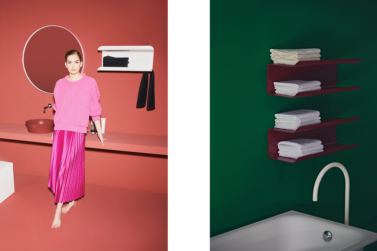 Diseñado por Ludovica Serafini + Roberto Palomba, JJ es un estante calefactor fabricado en aluminio reciclable: cuando está apagado, sirve como una práctica superficie para colocar toallas bien dobladas u objetos pequeños de baño; cuando está encendido, calienta las toallas y ofrece una agradable sensación de bienestar después de la ducha o el baño.