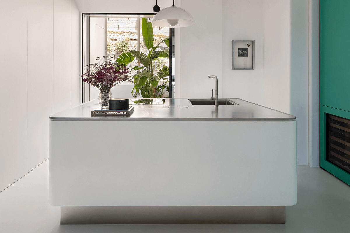 Fabricada a medida, Ego tiene puertas redondeadas a ras perfectamente integradas en la estructura, reforzadas internamente con paneles de aluminio alveolar que garantizan resistencia, ligereza y cierre silencioso, y compartimentos internos igualmente redondeados para facilitar las operaciones de limpieza y desinfección. Bisagra completamente invisible patentada por Abimis, fabricada en acero inoxidable y sin necesidad de ajustes; tiradores redondeados, disponibles en acero o en contraste en latón pulido o mate; encimera integrada sin juntas con borde elevado antigoteo.