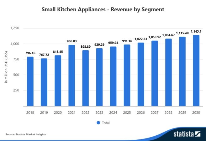 Las estimaciones de Statista Market Insights también muestran una tendencia al alza en los ingresos generados por los pequeños electrodomésticos de cocina en los próximos años. Más concretamente, se espera un crecimiento medio del 3% interanual entre 2025 y 2030, lo que llevaría al sector a superar los 1.000 millones de euros de ingresos en 2030.