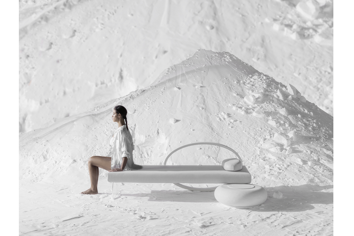 La colección, diseñada para Varaschin, está pensada para colocarse en el exterior de los spas y centros de bienestar. En ella se incluyen desde una cama con somier tapizado para utilizarse en sesiones de cromoterapia, pasando por una mesita auxiliar hasta un chaise longue cómodo y ergonómico. Todas las piezas se tiñen de Cloud Dancer, el color del año 2026, según Pantone.