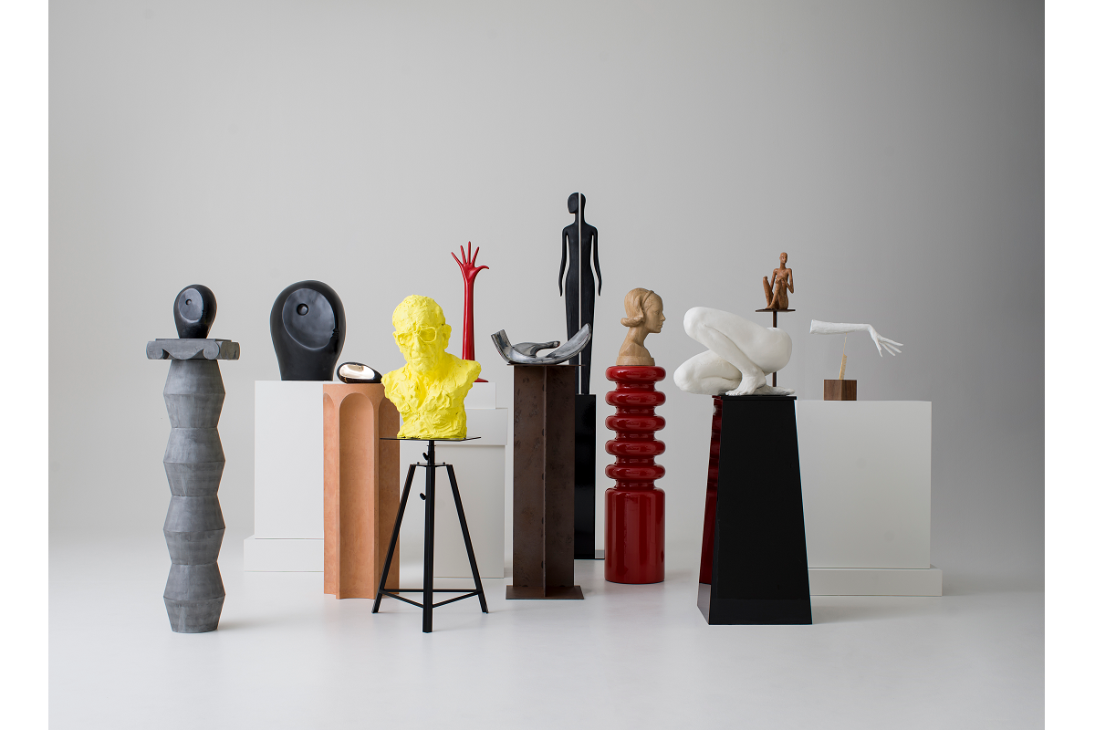 Cada objeto se combina con un podio que forma parte integrante de un sistema visual. Está diseñado para interactuar con la escultura que sostiene, al tiempo que conserva su propia identidad expresiva. Estos podios son más que simples soportes funcionales; son microarquitecturas escultóricas inspiradas en formas estructurales, industriales o urbanas. Cada uno de ellos tiene una referencia cultural distinta, reinterpretada a través de un diseño expresivo.