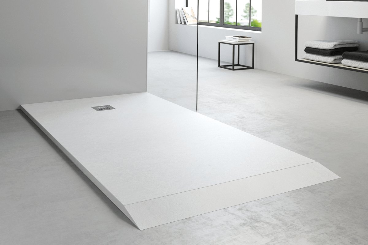 FOTO PRINCIPAL.: Plato de ducha Gravitzero de Nuovvo con instalación sobre el suelo y con rampa de accesibilidad.