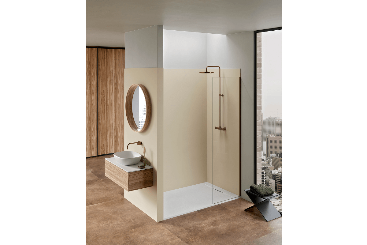 El plato de ducha Sunset de Nuovvo permite distintas configuraciones para adaptarse a las necesidades de cada obra: instalación enrasada, sobre el suelo o semiempotrada con un murete de obra.