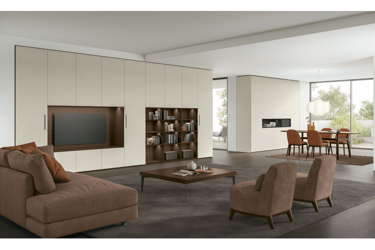 Logica Plus+ presenta un armario que se convierte en un elemento de diseño completo para la zona de estar, integrando múltiples funciones en una sola pared.