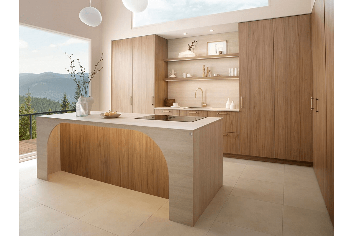 La cocina Firenze de la marca francesa encarna esta tendencia con una propuesta que apuesta por la discreción sofisticada. Sus frentes depurados en tonos claros y su cuidada combinación de madera Light Fox y travertino Valencia generan un ambiente sereno, casi arquitectónico, donde nada sobra y todo está pensado.