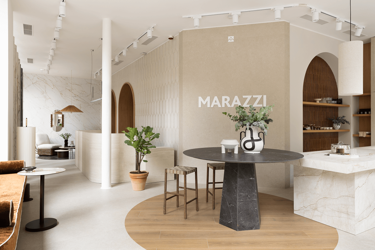 El showroom de Marazzi, rediseñado para inspirar, da la bienvenida a sus visitantes con espacios que destacan la versatilidad de las superficies cerámicas. En la planta baja, el elemento central es una cocina espaciosa y social que, gracias a los grandes ventanales con vistas al bulevar, es visible también desde el exterior. Esta ha sido realizada con las nuevas placas The Top Silver Root White en formato 160×320 cm. Esta superficie ha sido perfeccionada con la tecnología 3D Ink, que acentúa los detalles y la profundidad, transformando la encimera en un elemento arquitectónico con un fuerte impacto visual.