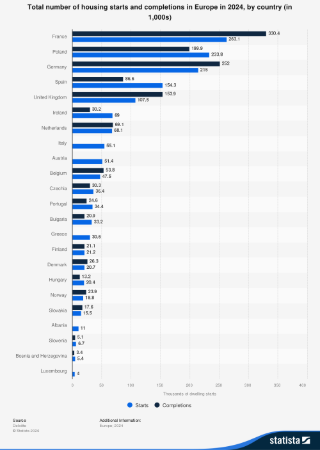 El hito de los 27 millones de viviendas se produce después de que el país concluyera en 2024 la construcción de 86.600 nuevos hogares. La cifra es considerablemente inferior a la de otros países europeos como Francia, Alemania o Reino Unido. Según el Índice de Propiedad Europeo, publicado por la consultora Deloitte, Francia es el país que más viviendas nuevas construye, al finalizar 330.400 hogares en 2024. Le siguen Alemania (252.000), Polonia (199.900) y Reino Unido (153.900). En relación con la construcción de viviendas iniciadas, pero no terminadas en el mismo año, la cifra de España se eleva hasta las 154.300, situándose como el cuarto país de Europa con mayores cifras de construcción de edificios residenciales.