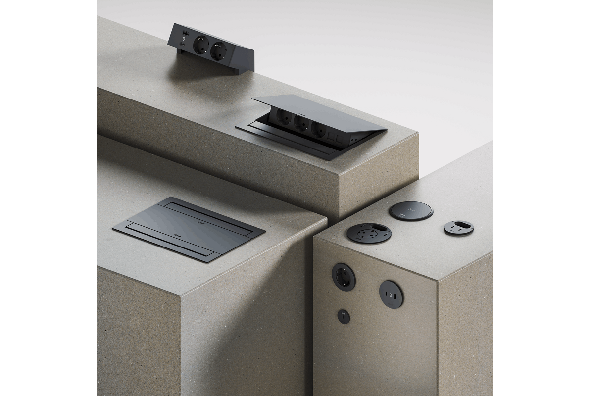 La colección ofrece soluciones de conectividad pensadas para integrarse dentro, bajo o sobre el mobiliario, con el objetivo de optimizar el espacio y facilitar el uso diario. Tomas de corriente, conectores de voz y datos, cargadores USB y conexiones multimedia quedan siempre al alcance del usuario, sin interferir en la estética ni en la funcionalidad del entorno de trabajo.