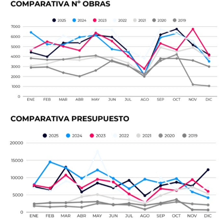El sector de la construcción en España se desploma en 2025 con un descenso tanto en el volumen de obras como en el presupuesto total invertido, en comparación con el ejercicio anterior. A lo largo del año se han ejecutado 47.952 obras, lo que supone una caída del 4,2% respecto ...