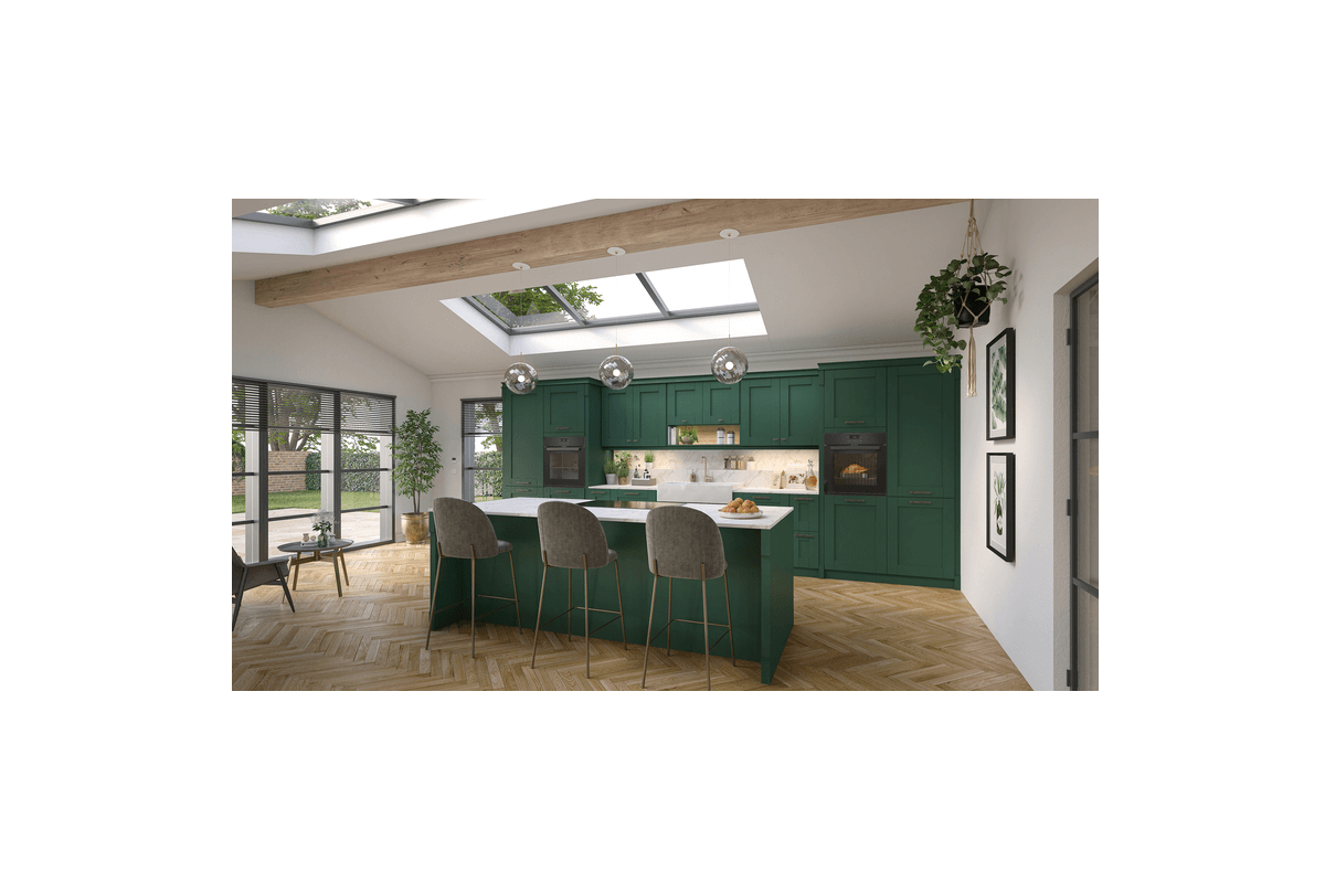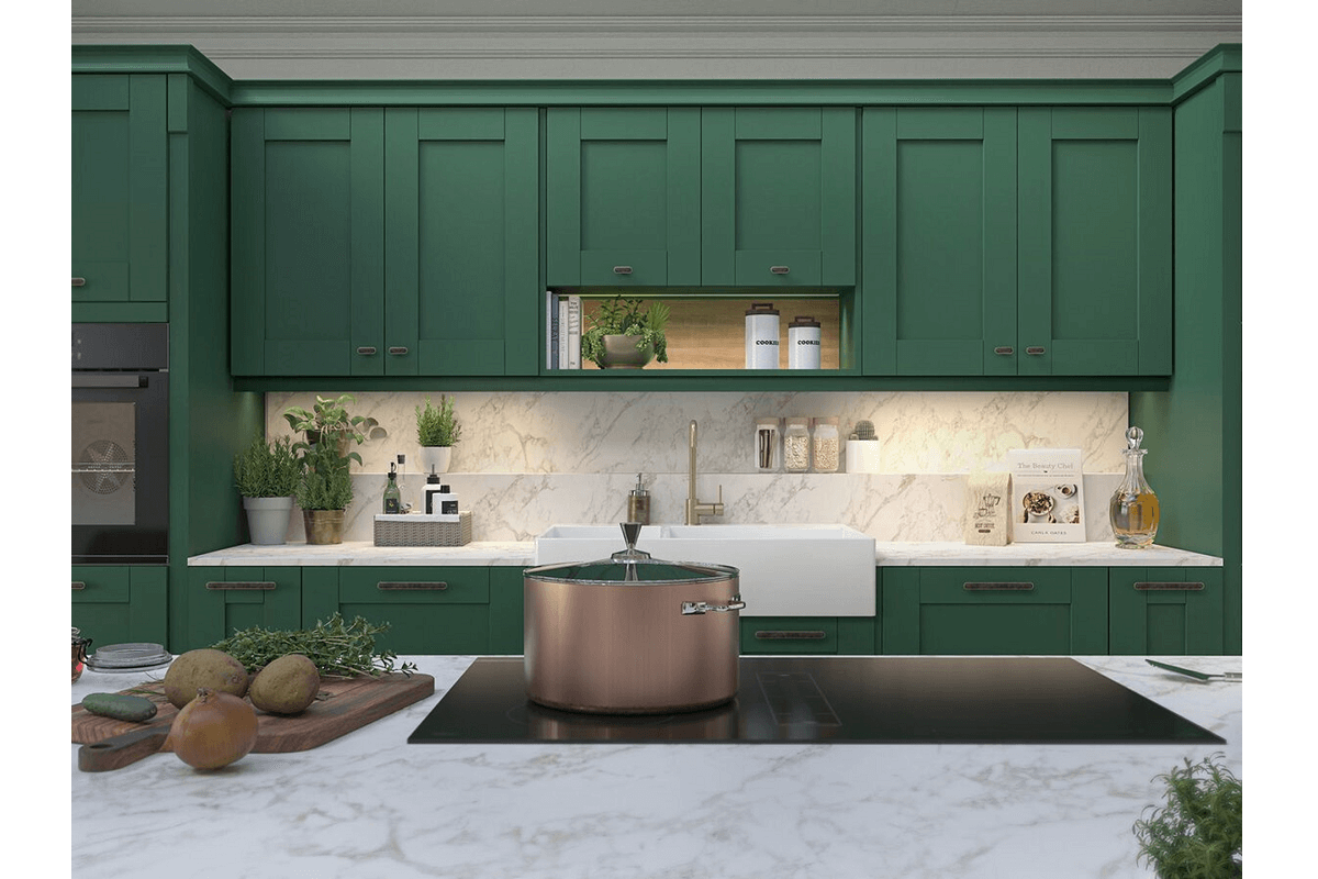 Un ejemplo del uso de este tono en la cocina es la cocina Bristol de Schmidt, de estilo cottage reinventa la estética de inspiración inglesa para crear un ambiente elegante y acogedor en la estancia. La sutil combinación del verde Forest Green y la encimera de color Gold Marmor, con efecto de mármol, otorga carácter y calidez a este espacio.