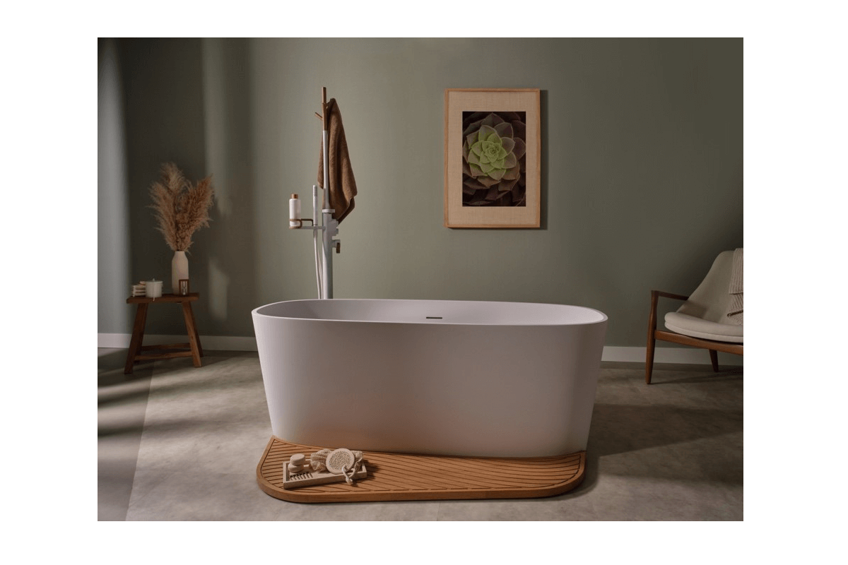 La bañera de la colección Lavi de Strohm, transforma el baño en un verdadero oasis de tranquilidad. Combinando diseño y funcionalidad con su bañera de mineral solid, acompañada por un grifo perchero y dos elegantes accesorios en madera de iroko: una bandeja y un reposapiés.